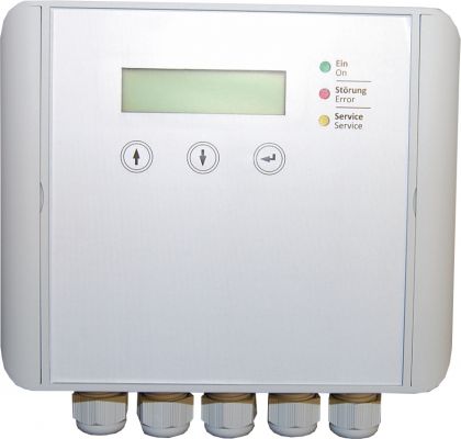 - Rot: Ozonierung: Ozonkonzentration ist innerhalb der eingestellten Grenzen. Der Raum kann jetzt nicht betreten werden! Eine vorhandene Störung, z. B. eine optionale Ansteuerung eines Türkontaktes, eine Störmeldung des Gerätes oder eines defekten Ozonsensors wird als Sammelstörmeldung über eine entsprechende LED in der Bedieneinheit signalisiert.